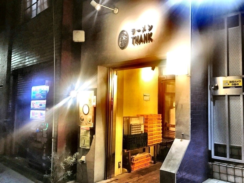 浜松町から大門へ抜けるメイン通りから脇の路地に入った穴場的なロケーショの「THANK」へ初訪店。外観も店内も、カジュアルフレンチ店かと思うような瀟洒な感じが印象的。スープはコッテリ度を選択でき、お初なので中間の「とろり」を注文したけど、十分濃厚で野菜の旨味が詰まったコク旨スープ。そこへストレート中細麺がいいバランスで絡み、スモーキーな手羽チャーシューがインパクトを与えてくれる…上品だけど力強い極上の鶏ラーメン!卓上の、酢で和えた野菜微塵切りを加えると、ピクルスのような柔らかい酸味とサッパリ感がプラスされ食感もいい感じに…これが鶏ポタスープとの相性最高!気付けばスープ最後の一滴まで完食&完飲。ご馳走様でした!