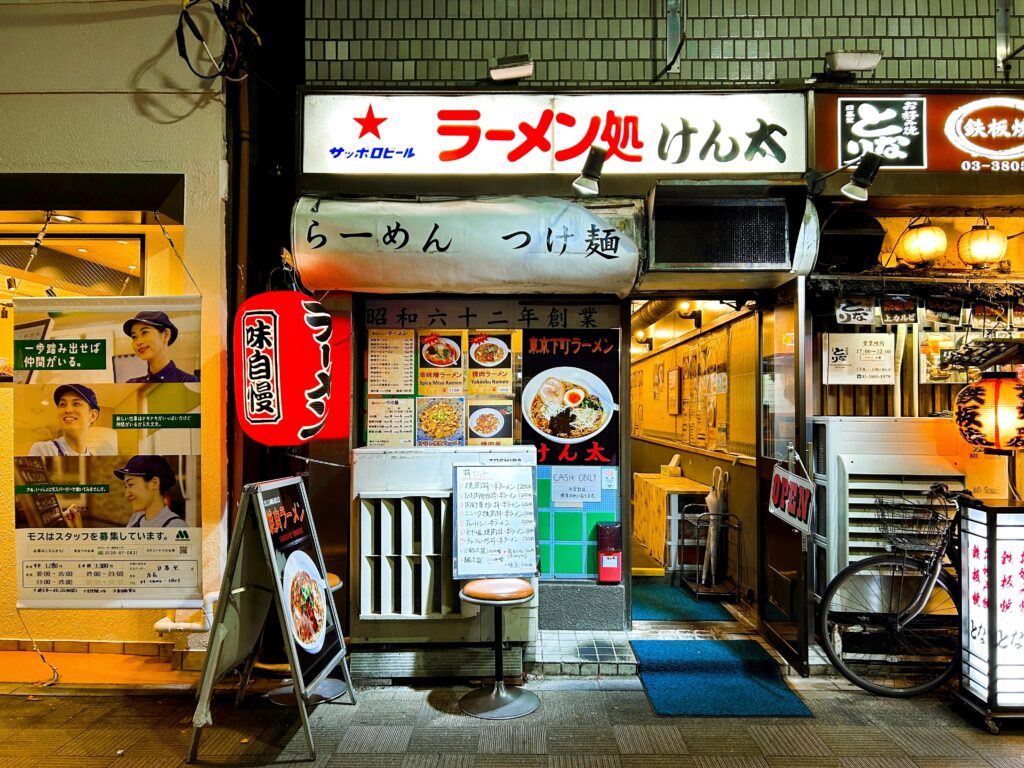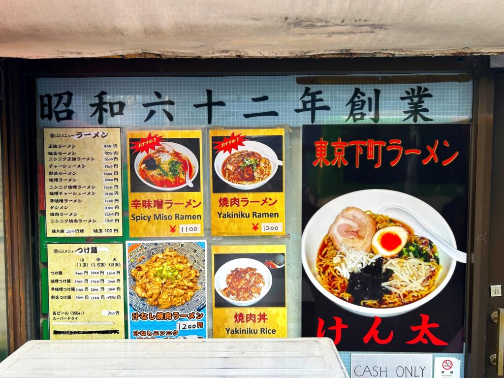 日暮里駅南改札から徒歩2分、繊維街に向かう途中にある「けん太」へ。店先に「昭和62年創業」と掲げてある通り、昔ながらのラーメン屋という店構えで、カウンターのみのこじんまりとした店内も味があっていい感じ。焼肉ラーメンが評判らしいけど、折角なので…昔ながらのシンプルな味を求めて「味玉ラーメン」を注文。あっさりした醤油スープ+縮れ中細麺の鉄板組合せに、とろける半熟味玉・極上の薄切りチャーシューが加わり、懐かしくも新しい…シンプルイズベストな一杯!後半戦は、卓上の胡椒・紅生姜を少々追加しながら、スープ最後の一滴まで完食&完飲。栄枯衰退の激しいラーメン界で40年近く愛され続けてきた味は伊達じゃない。店先に掲げてあった「東京下町ラーメン」、昭和に想いを馳せながらしみじみ味わわせて頂きました。ご馳走様でした!